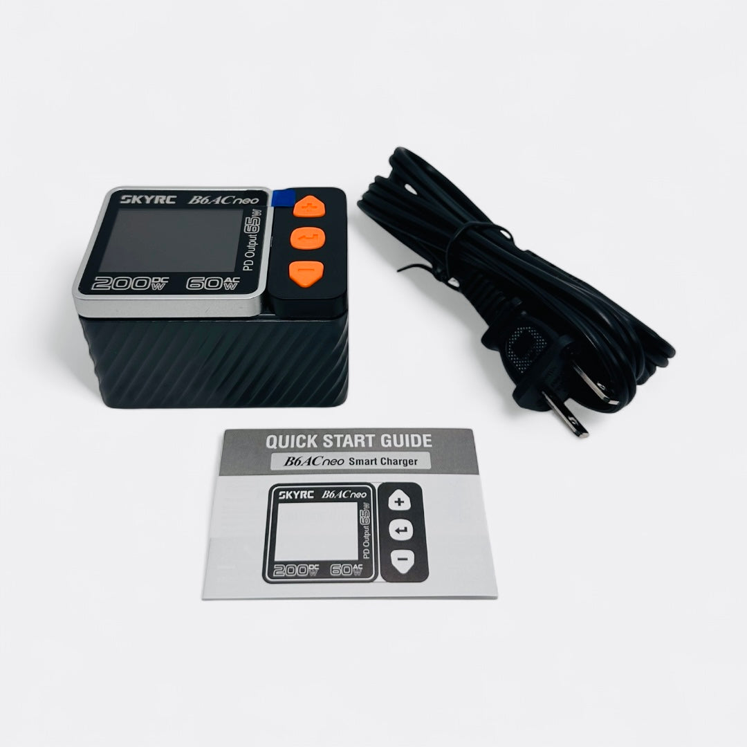 The SkyRC B6ACneo is a compact and powerful AC/DC smart charger that uses Gallium Nitride (GaN) technology, making it smaller than a credit card while maintaining high efficiency. It is an evolution of the iMax B6AC chargers and can deliver up to 200W of charging power with DC input and 60W with AC input, a significant increase from the original B6AC's 50W AC limit.